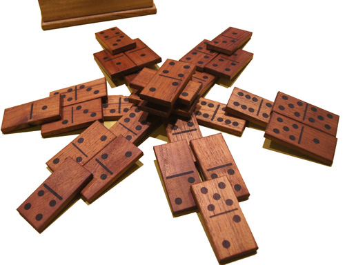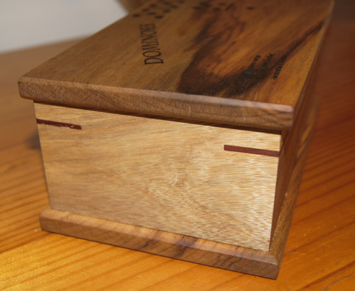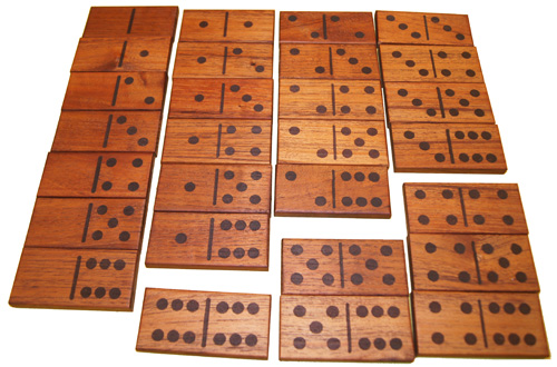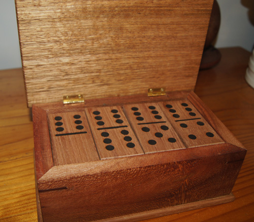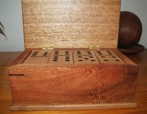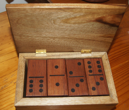 Dominoes set #1 $87.95 This 28 tile set is made from Red Cedar and have laser engraved dots. The tiles are 9cm x 4.5cm, great for the whole family to play with. The presentation/storage box is custom made to hold the 28 game pieces, and is made from Coachwood (base), Banksia (sides), and Tasmanian Oak (top). The corner splines are Rosewood. Tiles and box are finished with my home-made beeswax & mineral oil blend. Game instructions are included in the box.