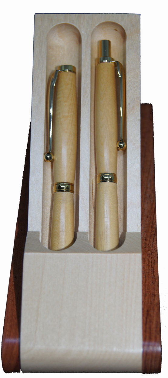 #10 - Pen & Pencil Set in attractive wooden display case. A slim set with gold hardware. $98