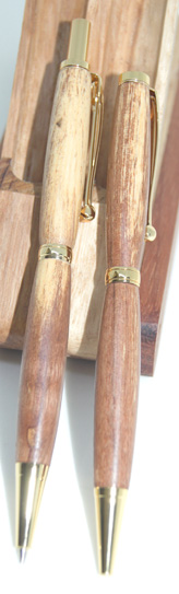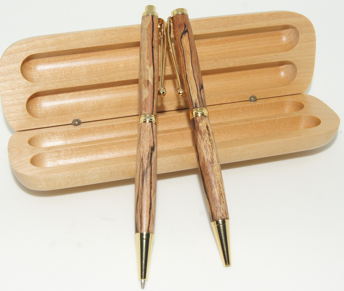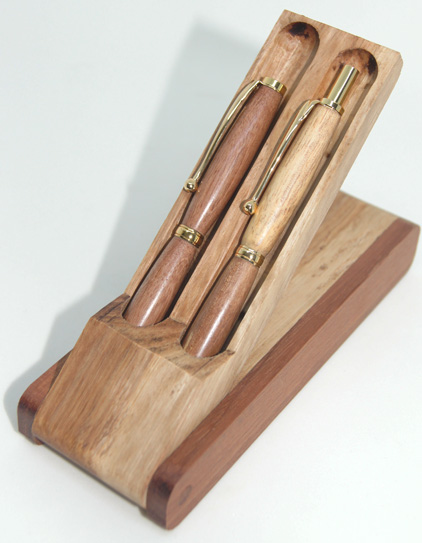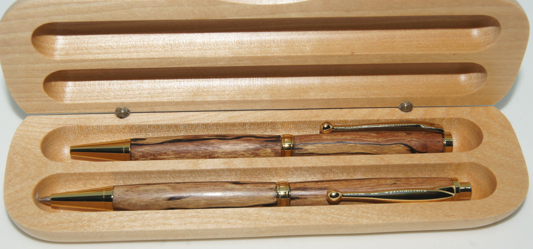# 10 - Pen & Pencil Set This striking spalted paperbark pen & pencil set will amaze your family, friends and colleagues and you'll appreceiate their beauty every time you use them. The gift box is made from a white maple. Price: $110.00