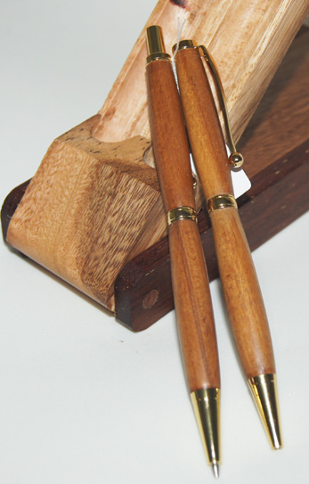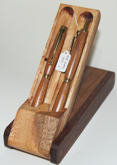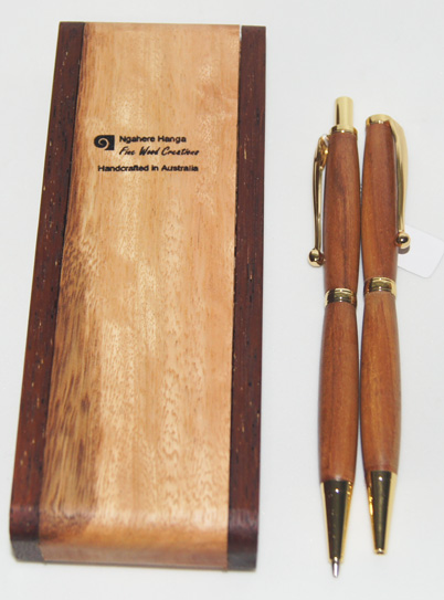 #1 The warmth of colour in the Rimu and gold hardware blend well together to create an attractive set of writing instruments. The set comes in a hand-made Tasmanian Blue Gum and Kwila display case. $94.95 |