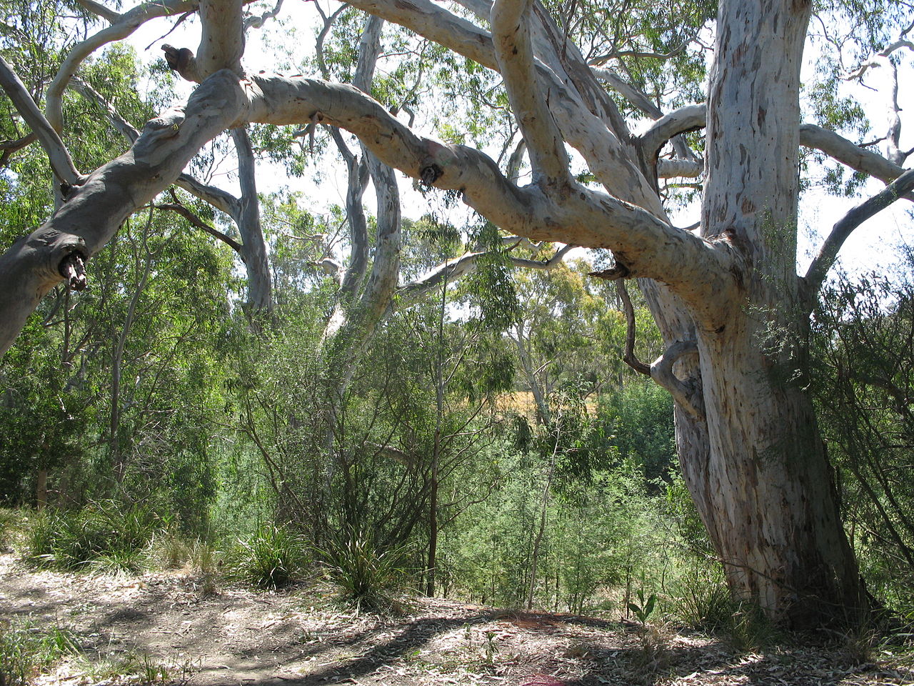River Red Gum is endemic to Australia, usually growing along watercourses across inland Australia. An interesting fact about these trees is that they can drop branches - sometimes the whole tree - without warning, making them commonly known as "widow-makers". They provide good summer shade from the heat, but taking advantage of it can be fatal.
