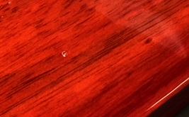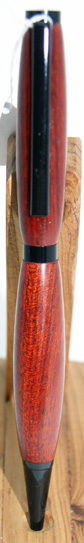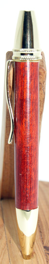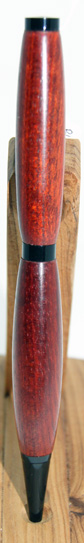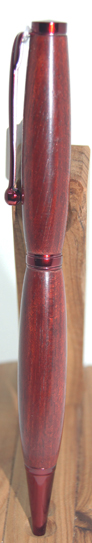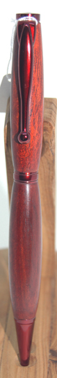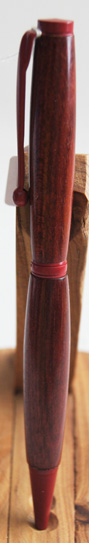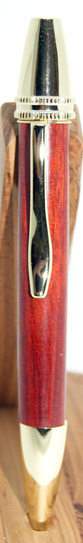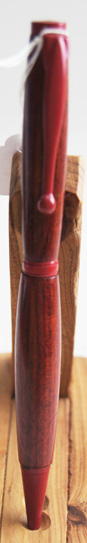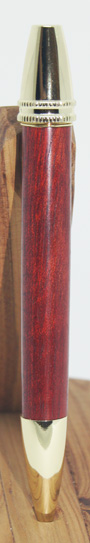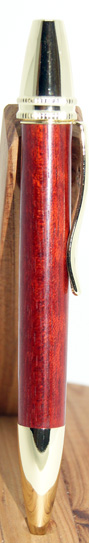 | #5 Beautiful rich red in this pen sure to please the eye. It looks better in natural light than in these photos. The gold hardware contrasts well with the timber. Twist top action extends and retracts the ball point tip. The refill for this pen is a standard Parker style and is accessed by unscrewing the nose cone.