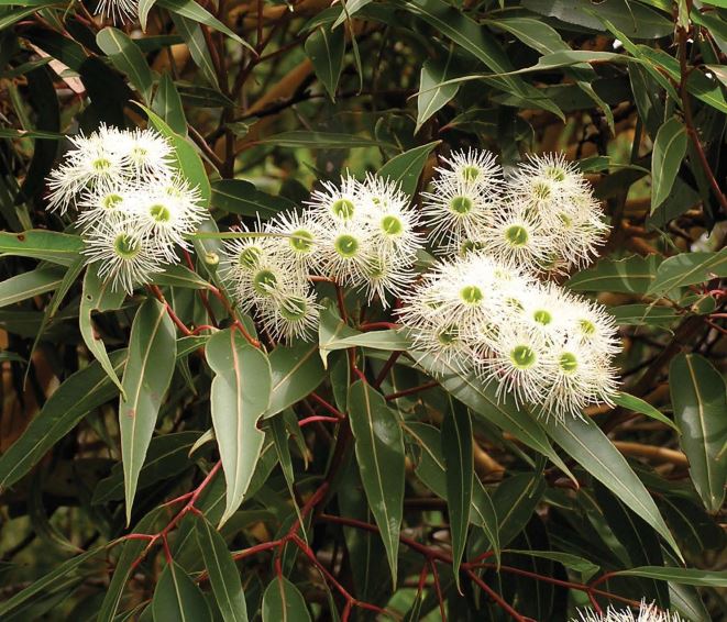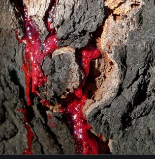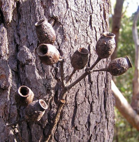 Bloodwood is a eucalypt that is endemic to eastern Australia. It has rough, scaly bark on the trunk and branches, lance-shaped adult leaves, flower buds in groups of seven, creamy white flowers and urn-shaped fruit. The timber is prized for it's rich blood red colour. If the bark is damaged the tree "bleeds" sap to protect and repair itself.