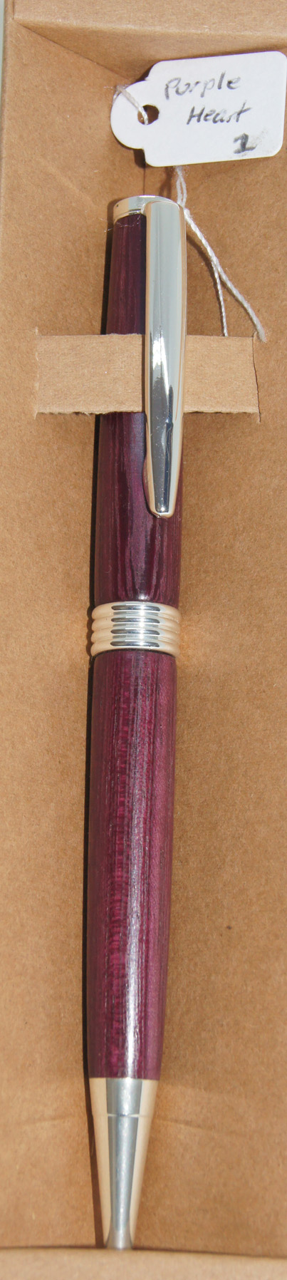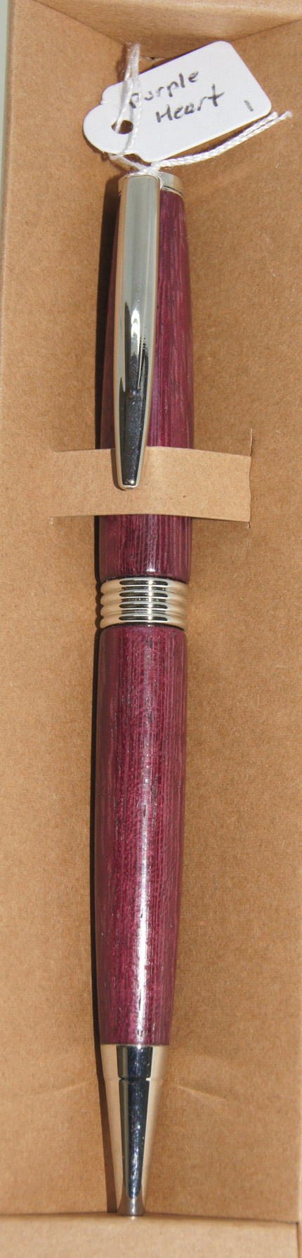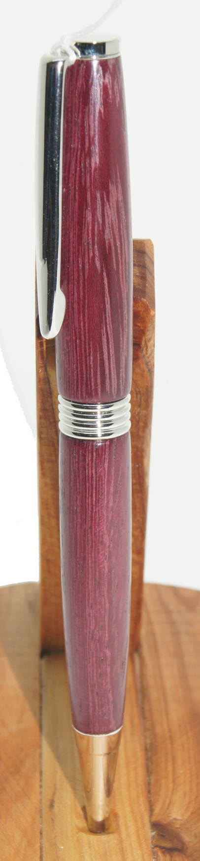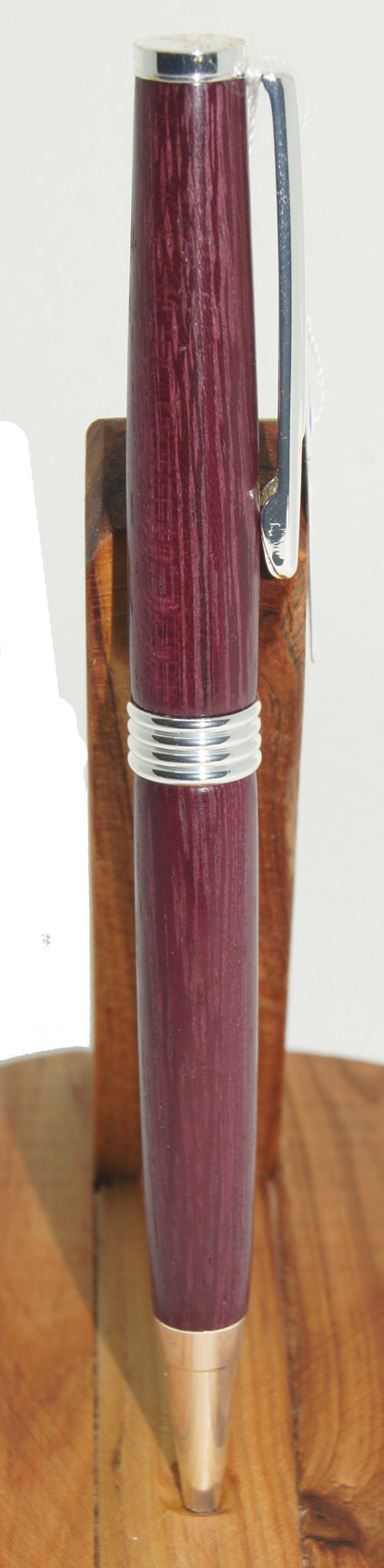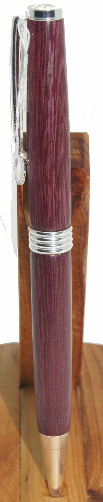 Purple Heart timber is an imported timber which is prized for it's beautiful consistent colour. When cutting it the colour is a bland grey-brown, but the colour changes to purple with exposure to UV light. Purple Heart is native to the tropical rainforests in the northern part of South America. It is often used for flooring and these pens were made from offcuts that were destined to be firewood.