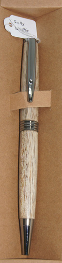 #5 This attractive pen is made from the sapwood bordering with the heartwood, hence the transition to brown showing on the one side of the pen. If you hold the pen horizontally and rotate it slowly you might see markings that remind you of a trout. The silver hardware is an elegant contrast to the timber. $47.95 |