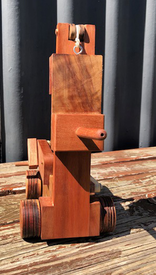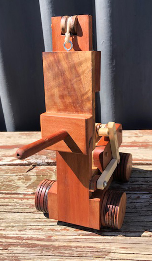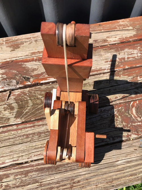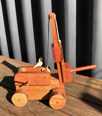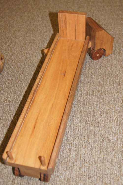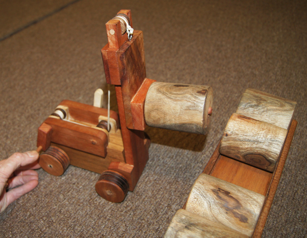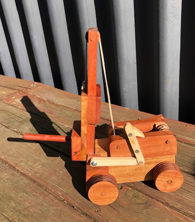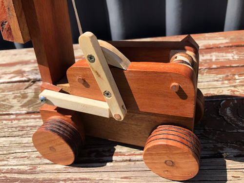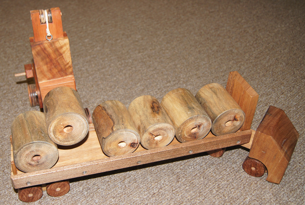 FORKLIFT Teamed with this purpose built forklift for many hours of fun loading and unloading the bales. The forklift is made using Blackbutt, Blackwood, Coachwood, Mandarin, Camphor Laurel, Red Ironbark, Rosewood and Silver Ash. I have drafted a full set of drawings for the forklift and these are available for purchase for $25. (pdf format)