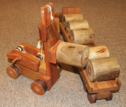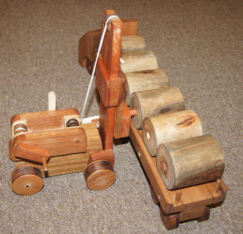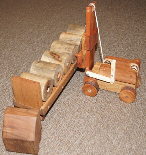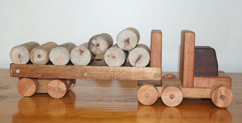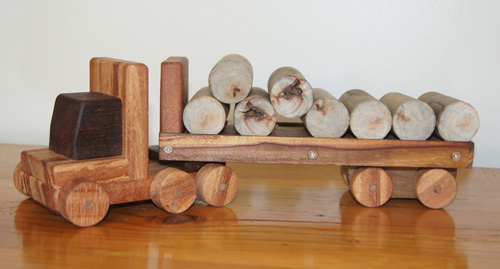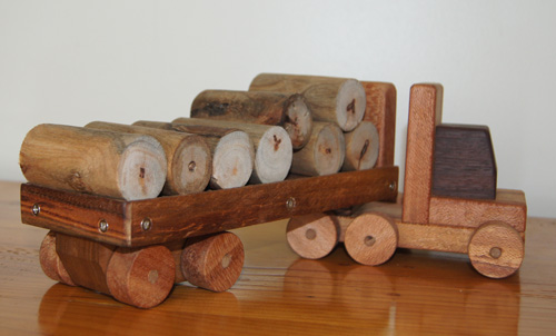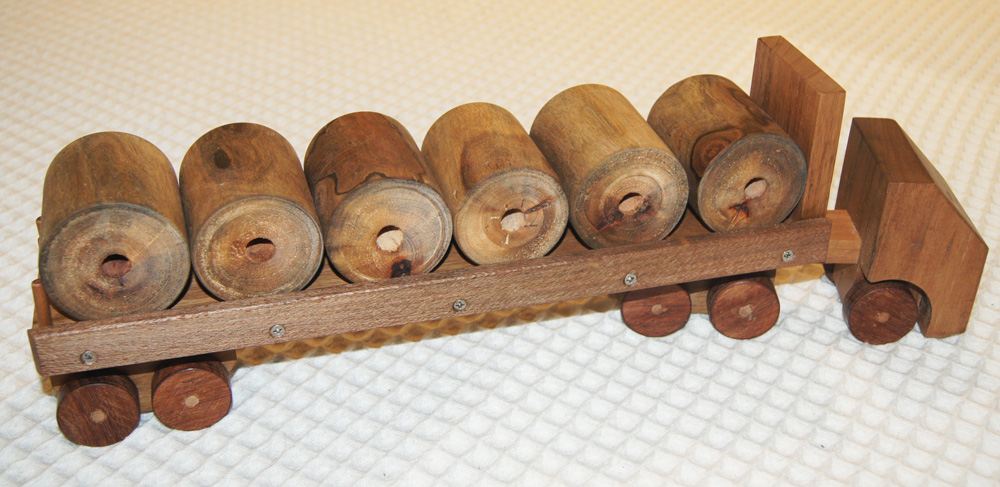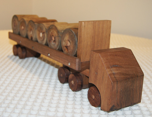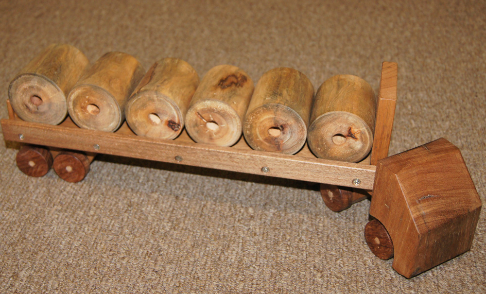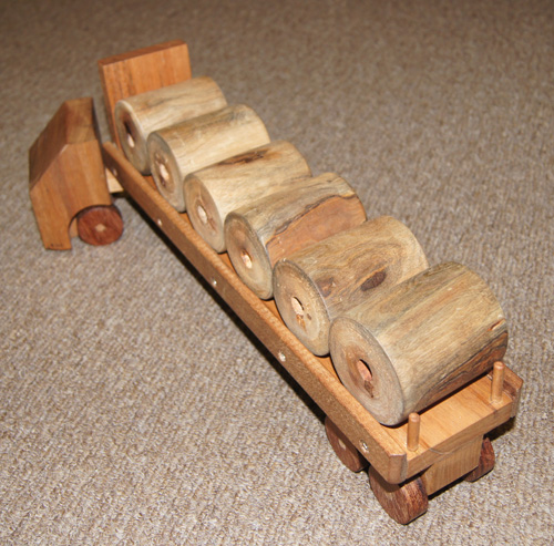 SEMI-TRAILER #1 This truck is made using Blackbutt, Spotted Gum and Illawarra Flame Tree, with Kwila for the wheels. It is 51cm long and 9.5cm wide. Trailer is 41cm long. The 'hay bales' are made from Camphor Laurel. I have drafted a full set of drawings for this truck and these are available for purchase for $25. (pdf format)