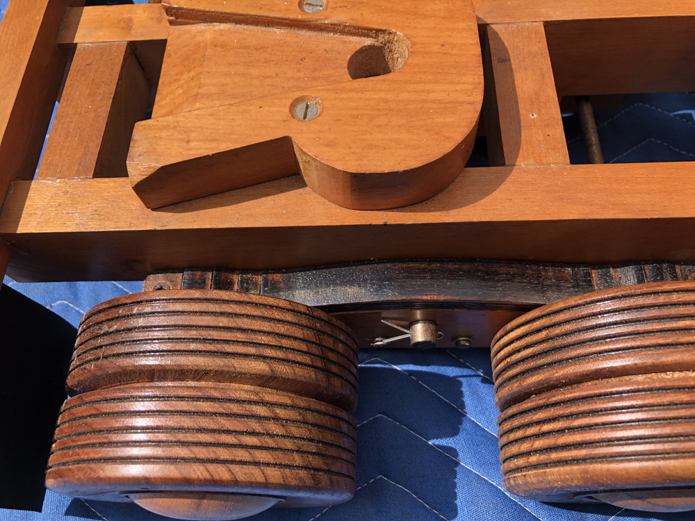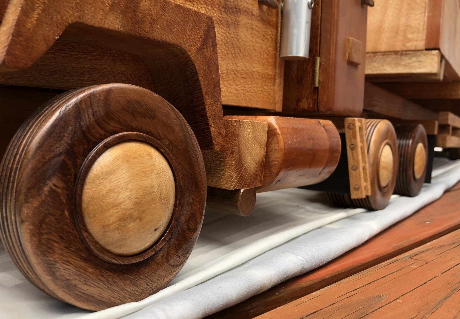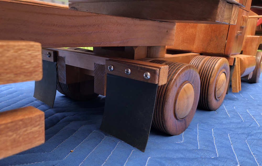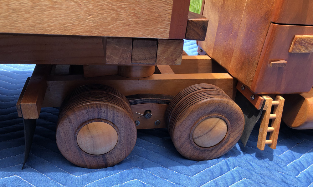 The Blackwood wheels are individually turned without the use of jigs or pattern copying equipment. Steel axles hold the wheels which are secured with Nylock nuts. Camphor Laurel hubcaps are press fitted into place. Floating bogie axles feature on the prime mover and trailer with cosmetic timber leaf springs on the prime mover. |