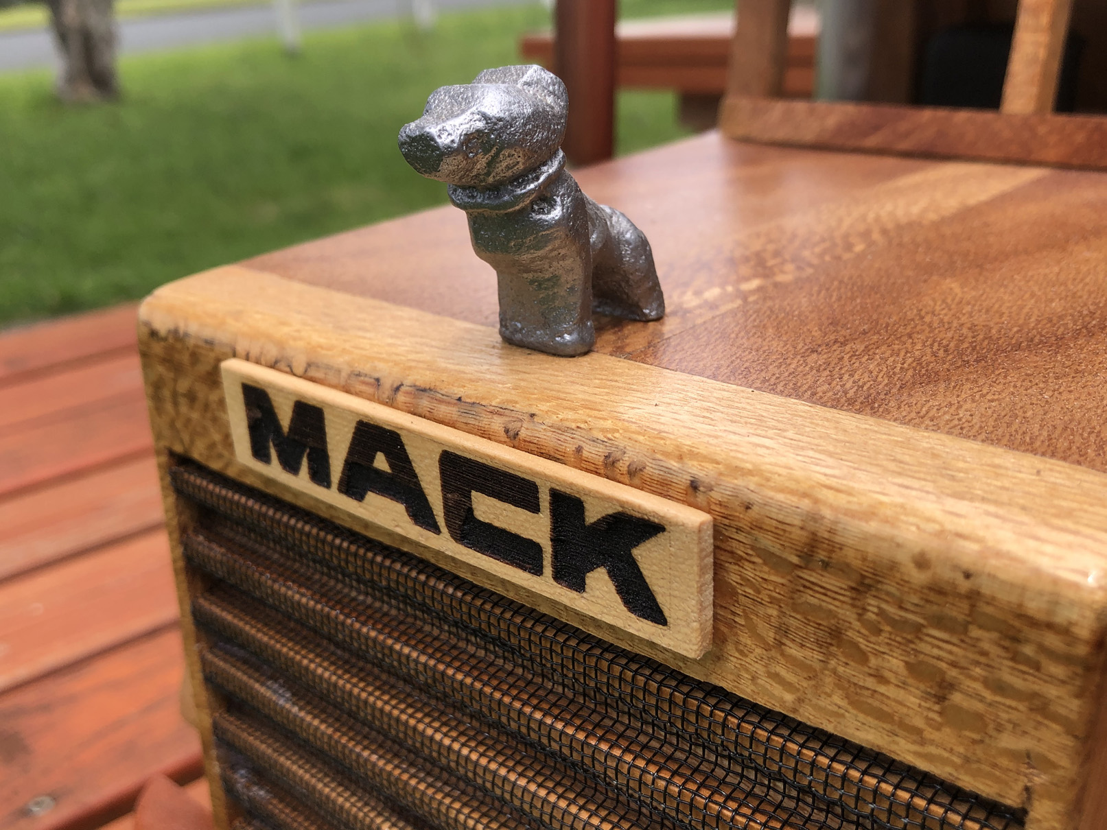 This truck is guaranteed one of a kind as design features were created by the craftsman to meet to the desired function of the project. The bulldog mascot is made from cast aluminium, using a hand carved special sacrificial foam that is replaced by the molten aluminium when poured into the sand mould. MACK lettering is laser engraved into Huon Pine. |