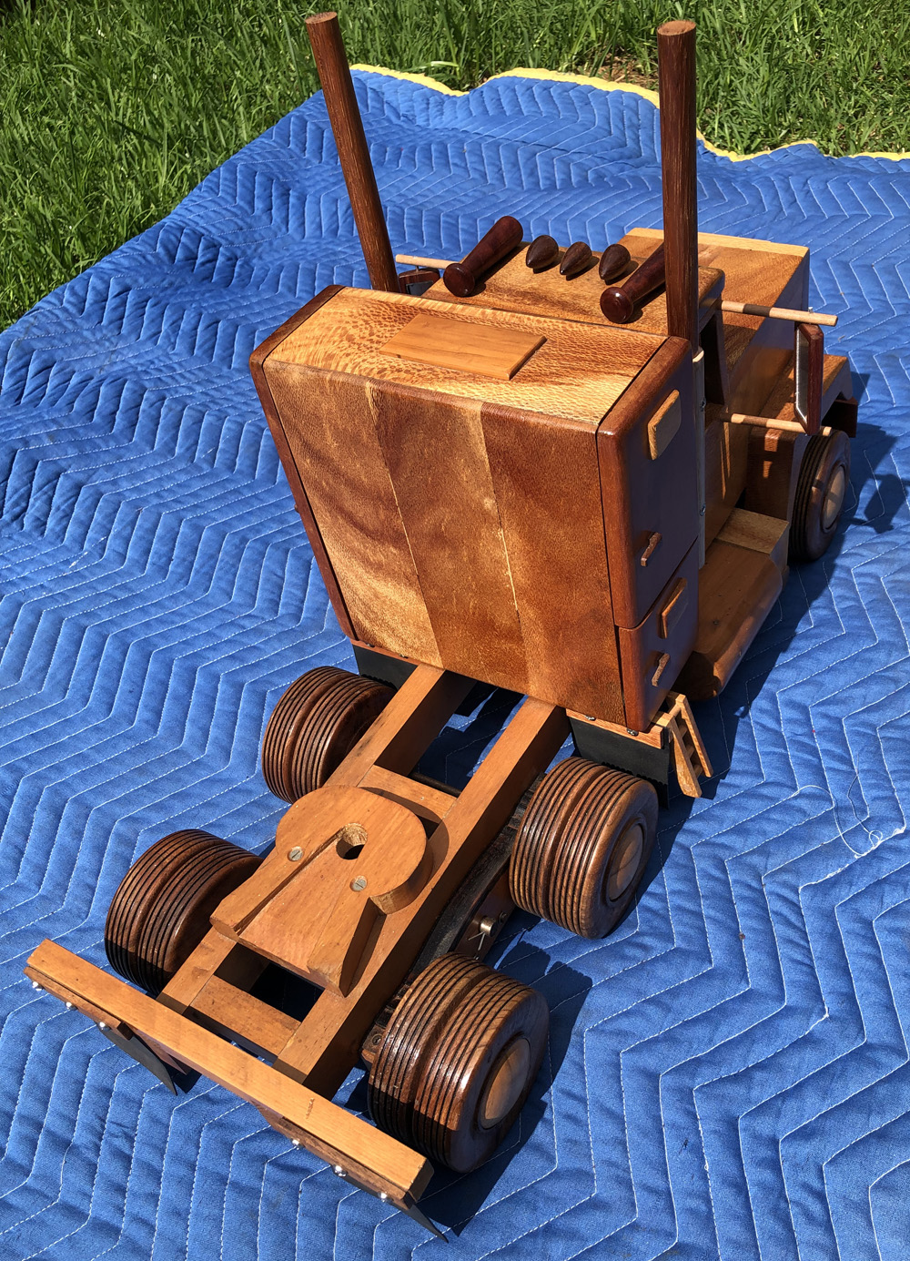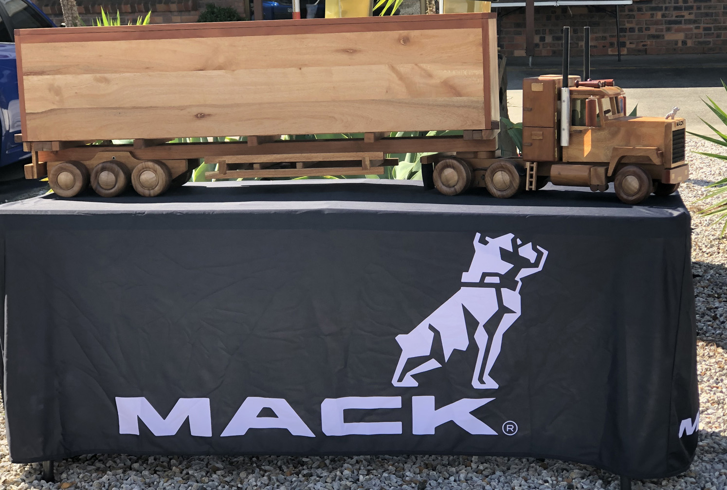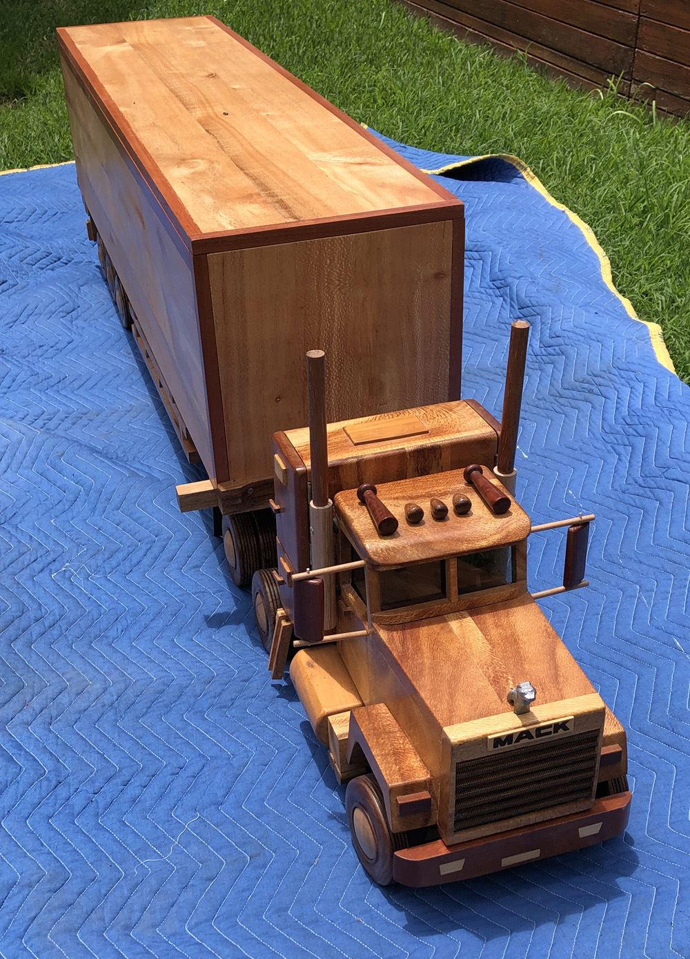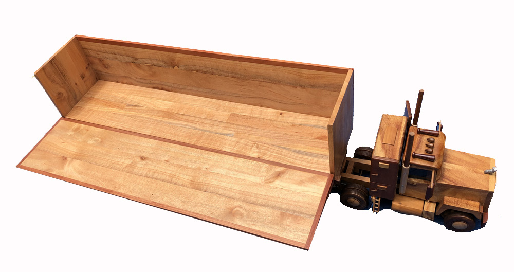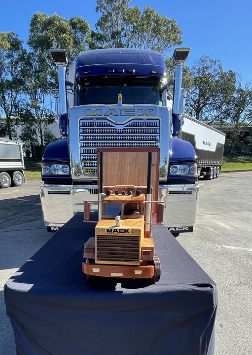 This beautiful handmade Mack Superliner was started nearly 30 years ago and has been a labour of love with multiple design challenges. It is truly unique and will be a great conversation topic in your home, office, showroom or boardroom. The dimensions are: Timbers used: