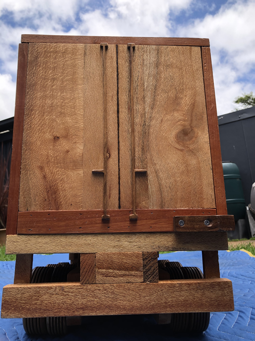 The trailer opens to form a display case or small desk surface. The lowered roof and wall are supported by concealed slide-out chassis rails with swing-down legs. It has been back to the workshop and had a new pair of exhausts fitted to keep more closely aligned with the timber theme (right photo). Mufflers are Tasmanian Oak, with Kwila pipes. On the cab roof, the airhorns are River Red Gum and lights are Blackwood. |