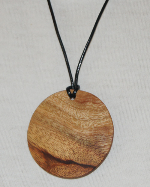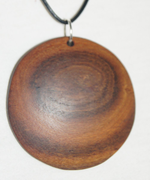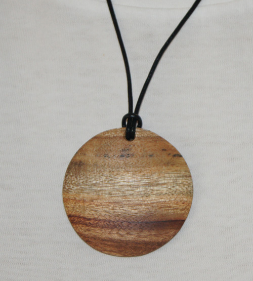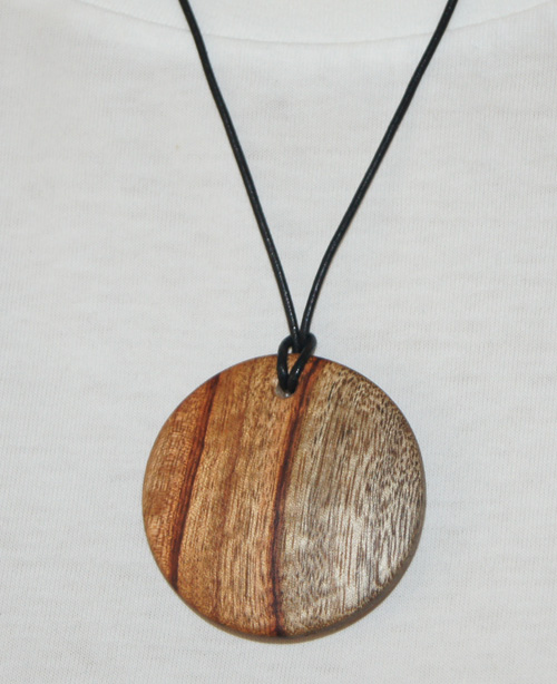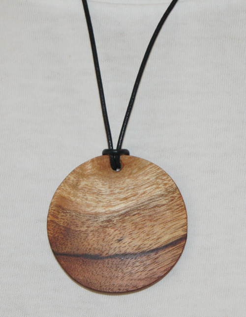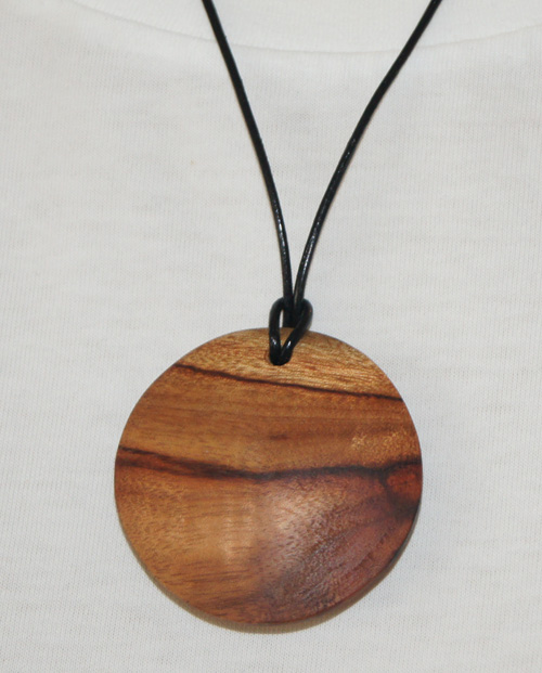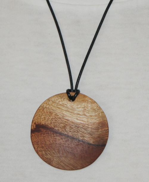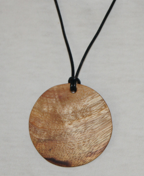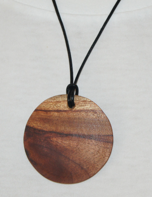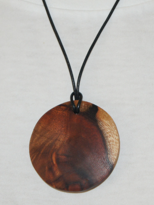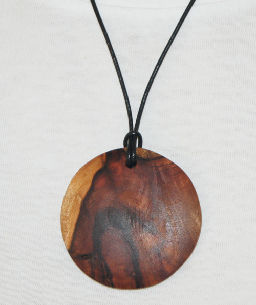 #1 Camphor Laurel Pendant The rich colours found in this piece will attract attention and please the eye. The 5cm hand cut pendant has convex faces is finished with mineral oil/beeswax blend. Suspended on 2mm leather cord 48cm long with a lobster clasp. Price: $20 |