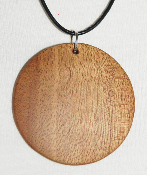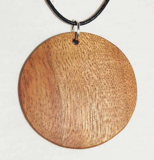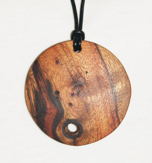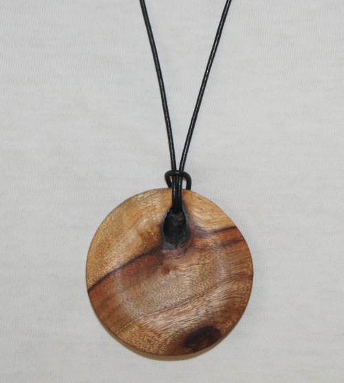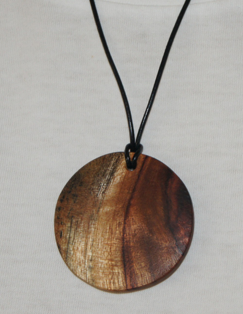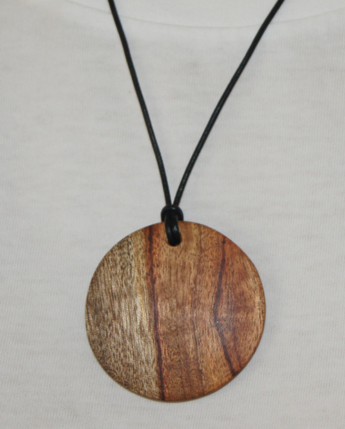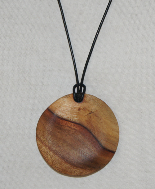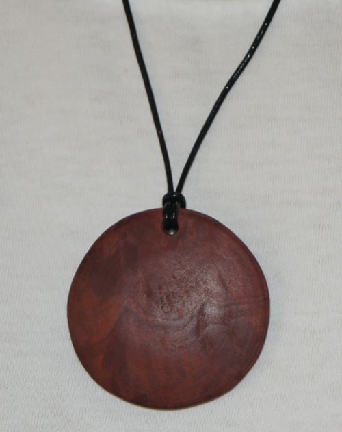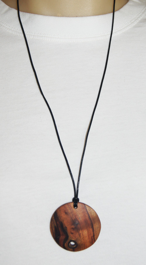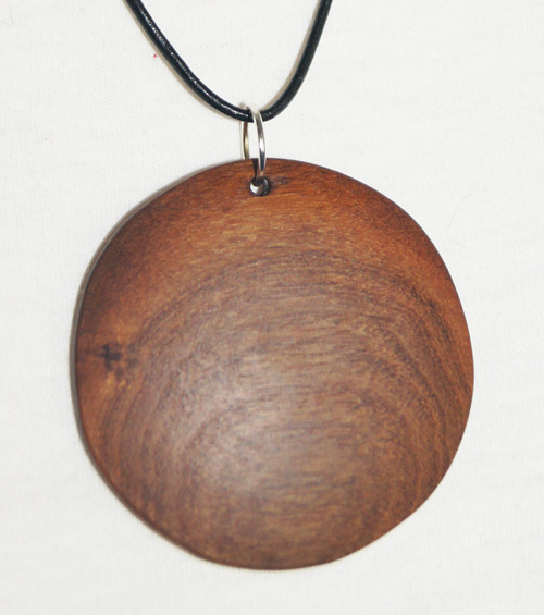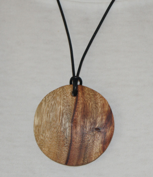 #1 Camphor Laurel Pendant The rich colours found in this piece will attract attention and please the eye. The 5cm hand cut pendant has convex faces is finished with mineral oil/beeswax blend. Suspended on 2mm leather cord 48cm long with a lobster clasp. Price: $20 |