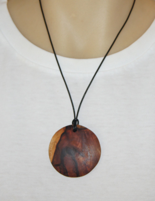 #9 Camphor Laurel Pendant The layers of contrasting colours found in this piece will be a joy to wear. The 5cm hand cut pendant has convex faces and is finished with mineral oil/beeswax blend. Suspended on 2mm leather cord 48cm long with a lobster clasp. Price: $20 |