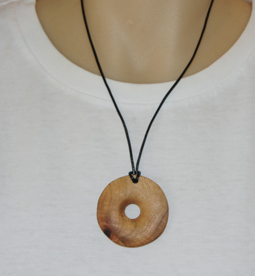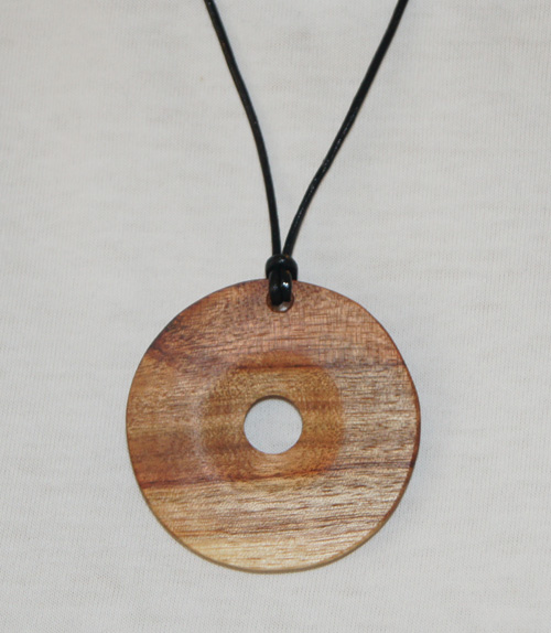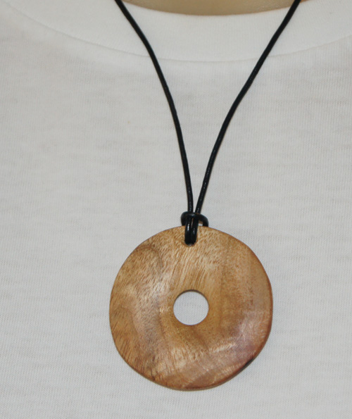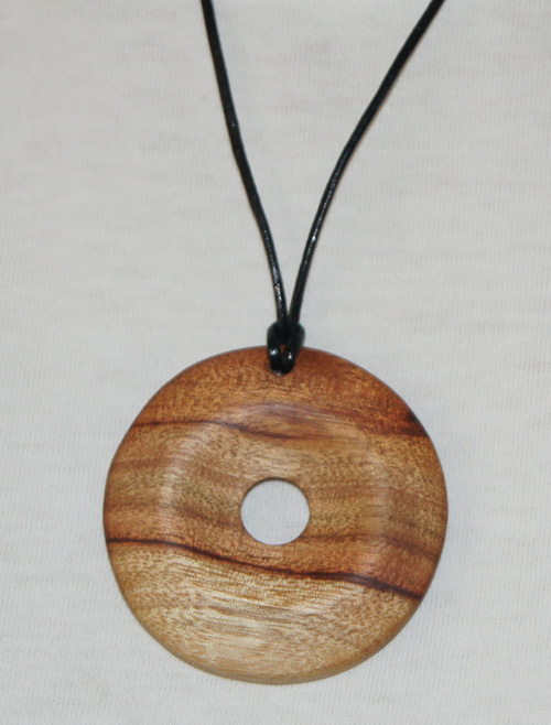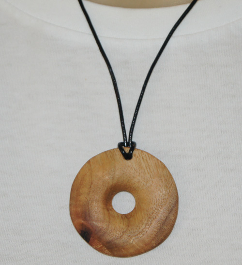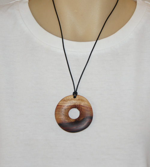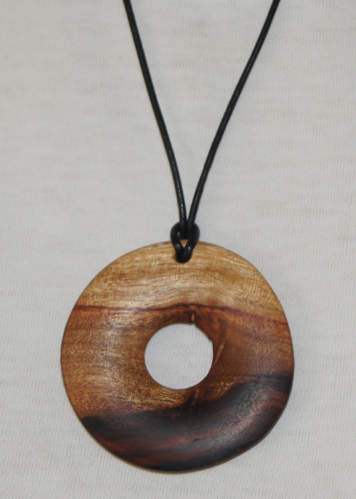 #4 Camphor Laurel Pendant The varied bands of rich colours found in this piece will be a joy to wear. The 5cm hand cut pendant is shaped a little like a donut and is finished with mineral oil/beeswax blend. Suspended on 2mm leather cord 50cm long with a lobster clasp. Price: $20 |