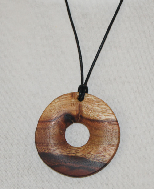 #6 Camphor Laurel Pendant The warm colours found in this piece will be a joy to wear. The 5cm hand cut pendant is shaped a little like a donut and is finished with mineral oil/beeswax blend. Suspended on 2mm leather cord 48cm long with a lobster clasp. Price: $20 |